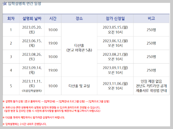 학교 홈페이지 내 [입학안내]-[입학안내프로그램신청]-[입학설명회신청]에서 신청가능합니다.
