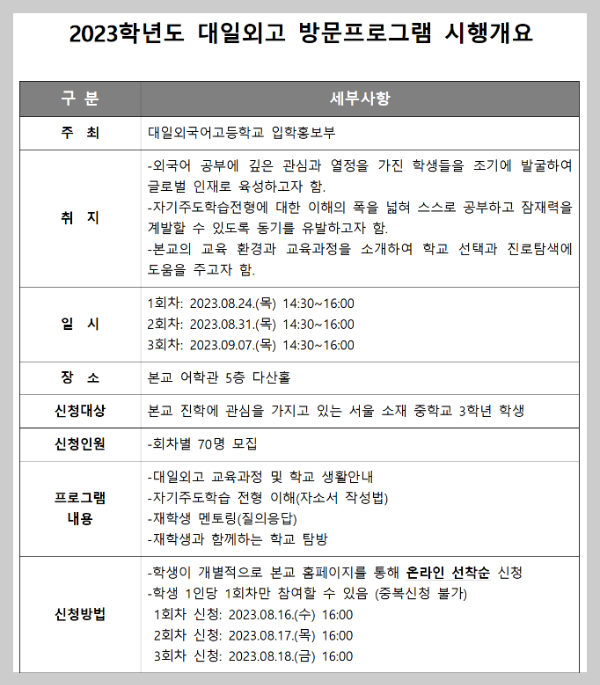 3. 대일외고 중 3 대상 방문프로그램과 입학설명회