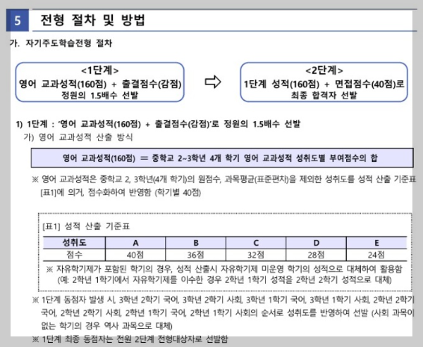 1단계에서 영어 교과성취도와 출결점수(160 만점)로 1.5배수(학교마다 조금씩 상이하지만 대일은 1.5배수) 선발하고, 2단계에서 면접(40 만점)으로 최종 선발합니다.