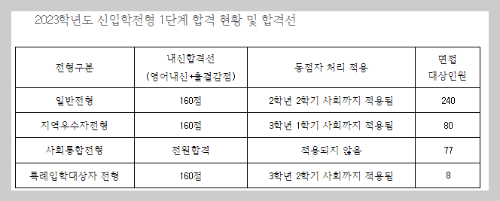 동탄국제고는 위와 같이 2023학년도 신입학 전형 1단계 커트라인을 발표했습니다.