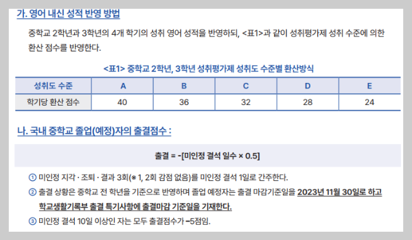 1단계는 영어내신성적(160점) + 출결(감점)으로 진행됩니다.