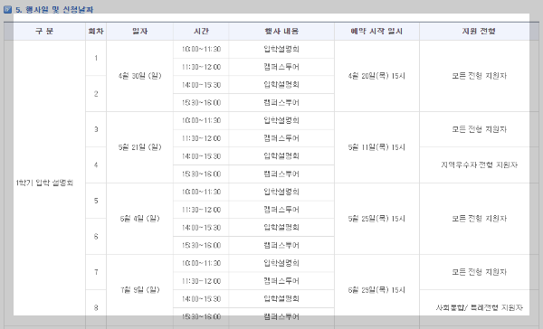 회차별로 설명회의 대상 전형이 다르므로 일정별 내용과 지원 전형을 확인하고 신청하시기 바랍니다.