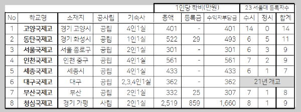 위에 언급했듯이 청심국제고를 제외한 나머지 7개 국제고는 공립고등학교이기 때문에 2021년 전면 무상교육 확대로 등록금이 0~29만원 사이입니다.