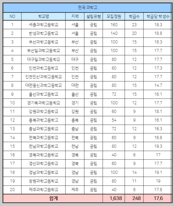 전국에 20개의 과학고등학교가 있으며 아래와 같습니다.