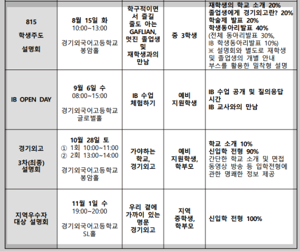 1학기 기준 6월까지 입학설명회가 진행된 경기외고는 8월 15일에 중 3학생을 대상으로 2024 입학전형을 안내한다고 합니다.
