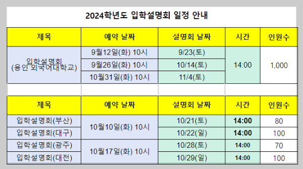 입학설명회의 경우 지원을 희망하는 학생에게 큰 동기부여를 줄 수 있는 기회이므로 참고하시기 바랍니다.
