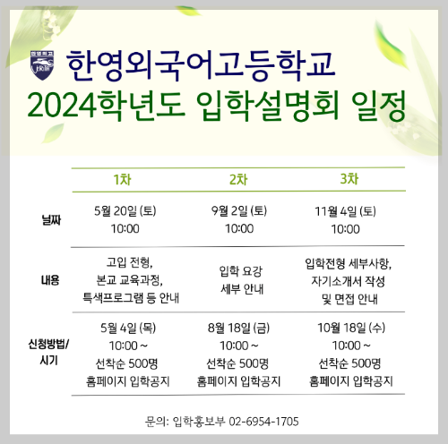 한영외고는 2024학년도를 위한 입학설명회를 총 3차에 걸쳐서 진행합니다.