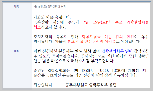 공주사대부고가 7월 15일의 입학설명회를 충청지역의 폭우로 인해 부득이하게 취소했습니다.