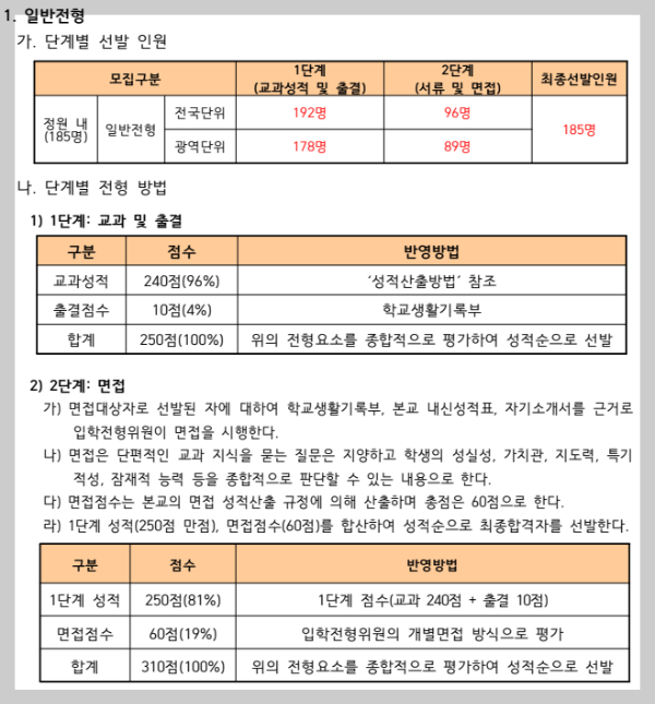 2023학년도 기준 김천고 입학전형에 필요한 교과성적 산출표와 간단한 입학요강은 다음과 같습니다.