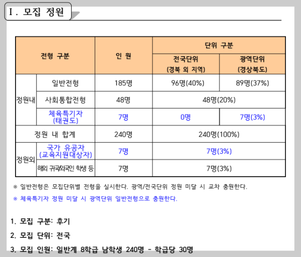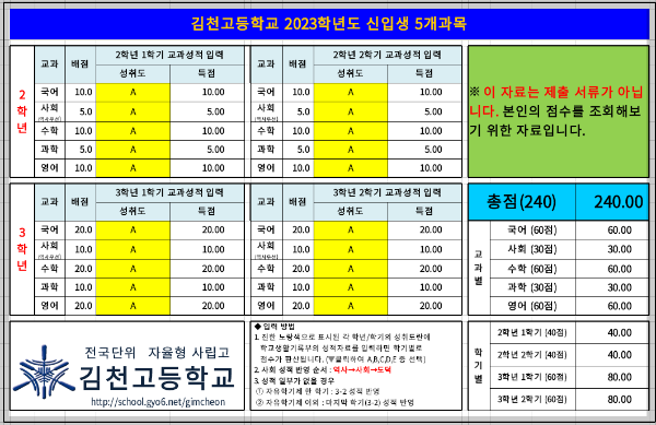 2023학년도 기준 김천고 입학전형에 필요한 교과성적 산출표와 간단한 입학요강은 다음과 같습니다.