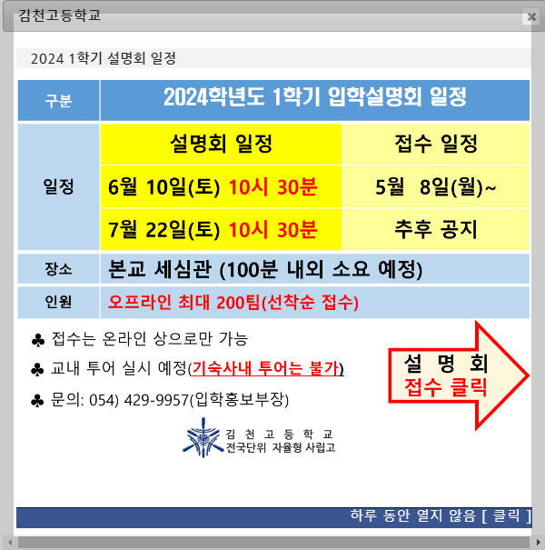 김천고의 경우 설명회가 회차가 많지는 않으므로 관심 있는 친구들은 미리 접수 일정 확인하고 설명회에 참석해보시기 바랍니다.