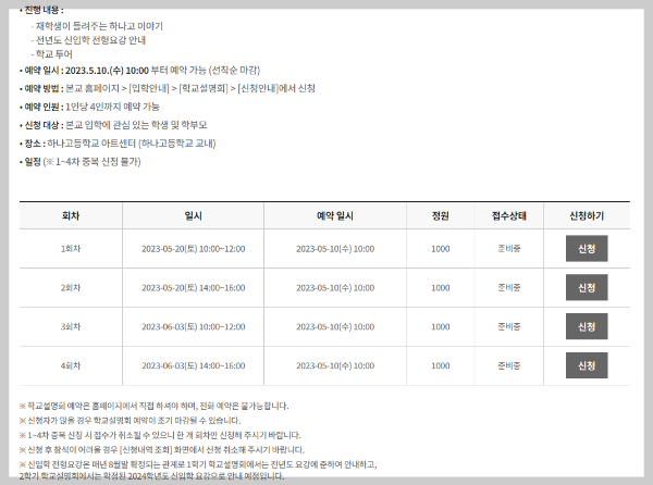 현재는 1학기 입학설명회 일정이 나와 있으며 내용은 재학생이 들려주는 하나고 이야기, 전년도 신입학 요강, 학교 투어로 구성되어 있습니다.