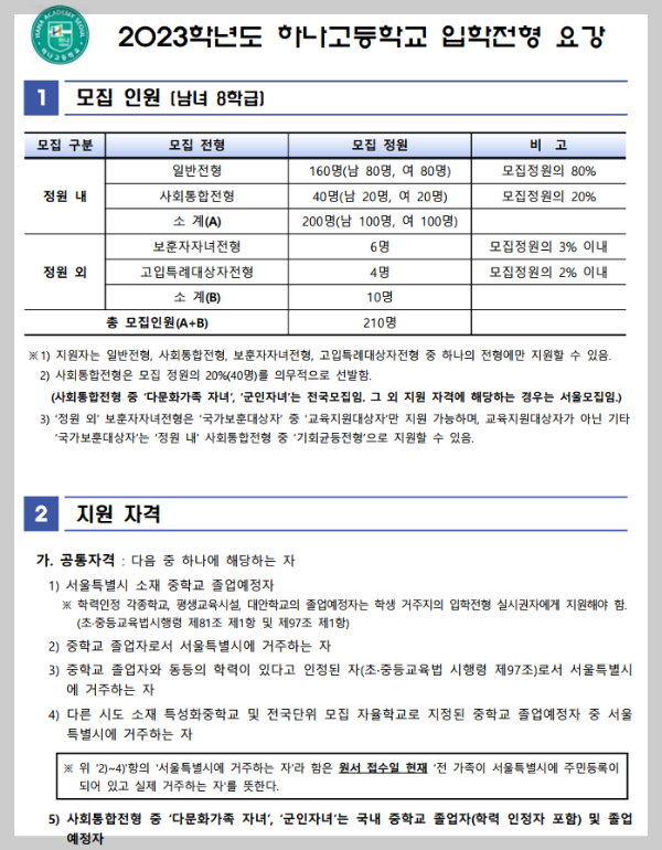 하나고는 전국단위자사고라고는 하지만 일반전형을 모두 서울시에서 선발하기 때문에 서울지역자사고로 여겨지는 부분도 있지만, 20%에 해당하는 사회통합전형은 전국단위이기 때문에 전국단위자사고로 분류됩니다.