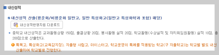 중학교 내신점수는 중학교 생활 중 교과와 비교과항목(출결, 봉사, 창체, 행동발달) 200점 만점, 혹은 300점 만점으로 산출한 점수입니다.