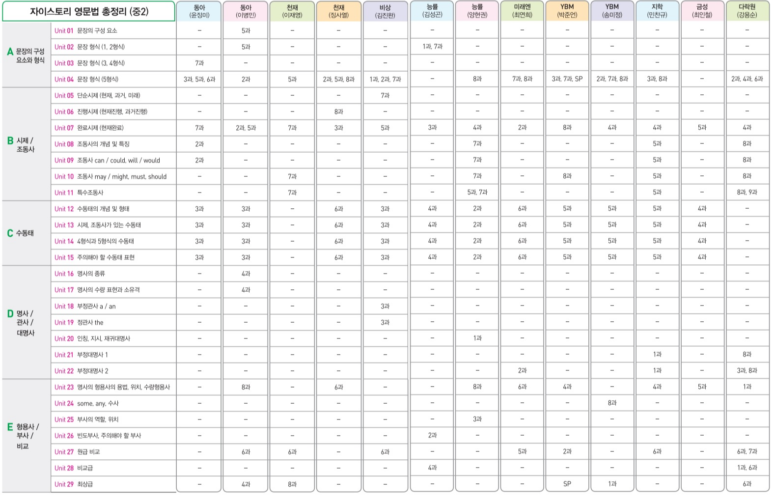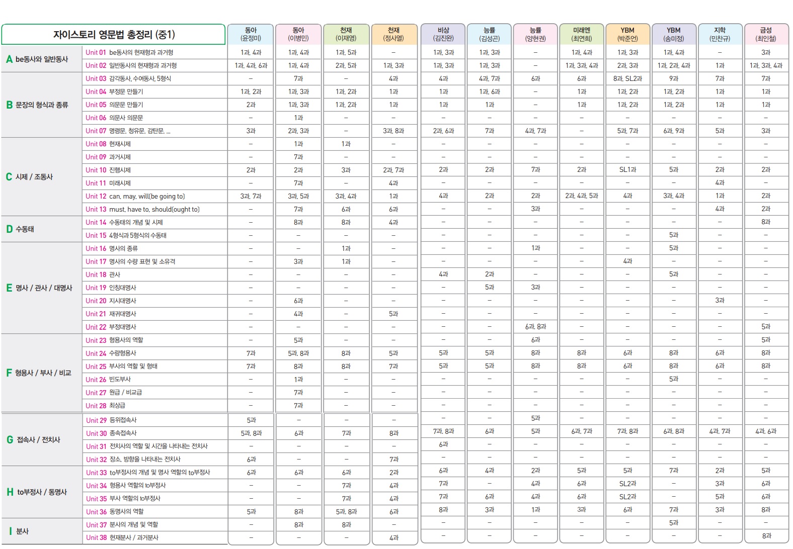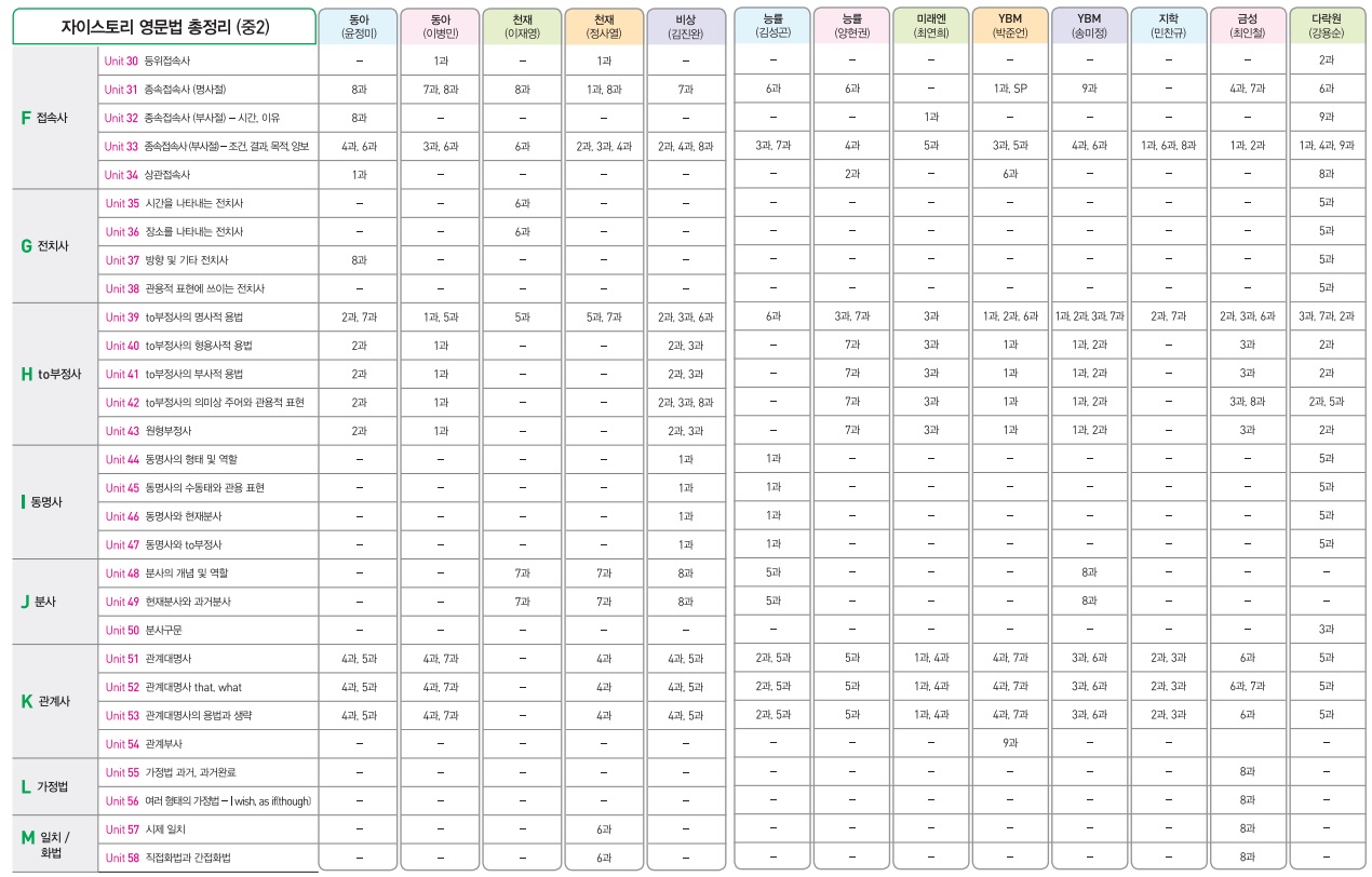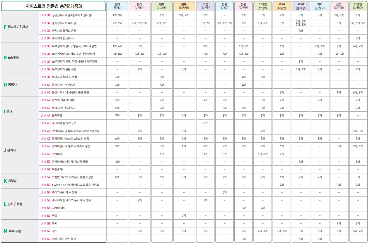 각 출판사별 문법 내용은 다음과 같습니다.