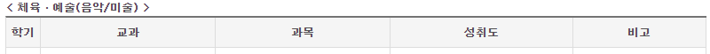 체육, 음악, 미술은 다른 과목과 분류되어 기재되고 세특도 성취도 아래에 별도 기재됩니다.