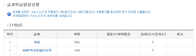 1학년은 자유학기제 혹은 자유학기제 기간 동안은 Pass의 의미인 P로 표시됩니다.