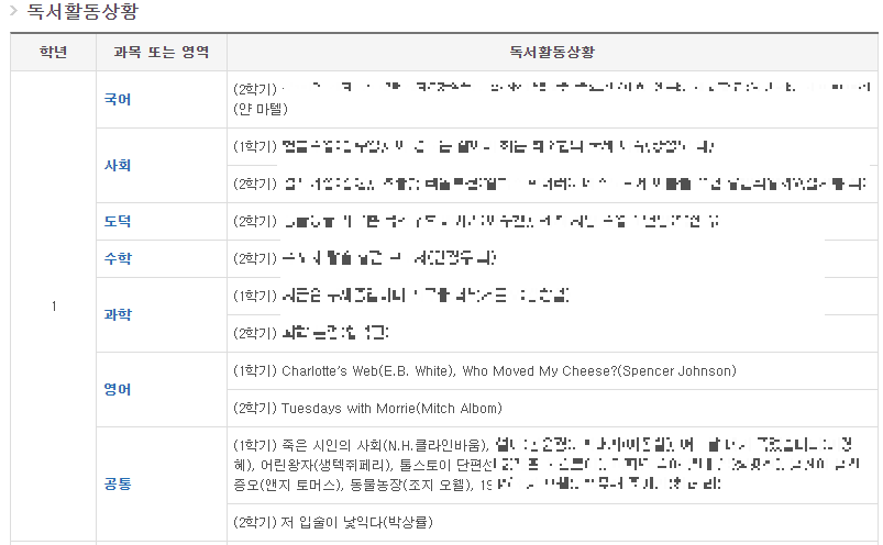 읽은 책의 제목과 저자를 기재합니다. 각 해당교과와 관련된 독서활동을 교과담당교사가 입력하고, 특정 교과에 해당하지 않을 경우 담임선생님이 공통으로 입력할 수 있습니다.