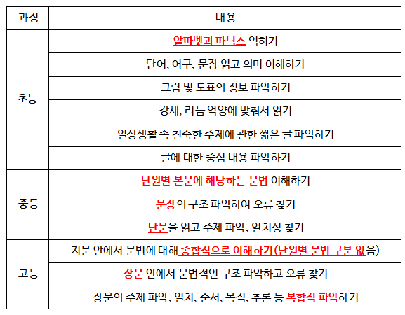 기본적으로 영어 문자를 읽고 쓰는 것을 시작으로, 음가(파닉스)를 이해하여 단어와 짧은 문장을 이해하는 데 목적이 있습니다.