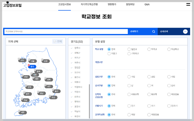 위의 고입정보포털 사이트 내 학교정보조회를 통해 지역별/유형별 고등학교를 조회해볼 수 있습니다.
