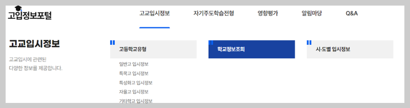 위의 고입정보포털 사이트 내 학교정보조회를 통해 지역별/유형별 고등학교를 조회해볼 수 있습니다.