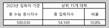 서울 상위 15개 대학을 입학하는 인원은 총 수능 응시자수의 10%로 보면 됩니다.