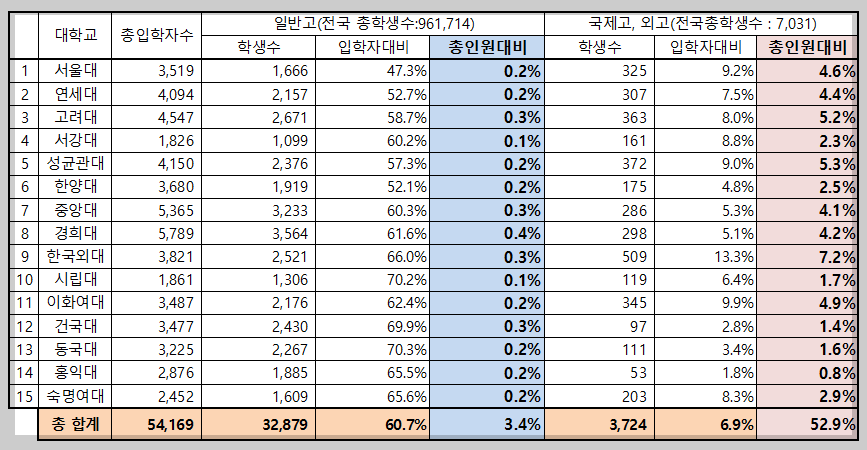 2023년 모집인원인 7,031명을 기준으로 한 비율로도 상위 15개의 대학 입학자수가 국제고, 외고 총학생수의 절반이 넘습니다.