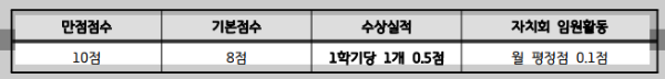 학교활동의 경우 기본점수 8점을 부여하고, 자치회 임원활동은 월 15일 이상은 1개월로 인정하여 점수를 부여합니다.