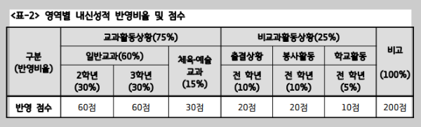 반영기준은 교과활동상황은 3학년 2학기 1차 지필평가까지, 나머지는 3학년 10월 말까지 반영합니다.