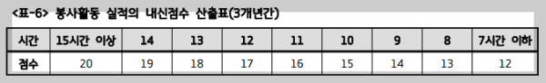 봉사활동은 3개년을 구분하지 않고 총 15시간을 만점으로 합니다.