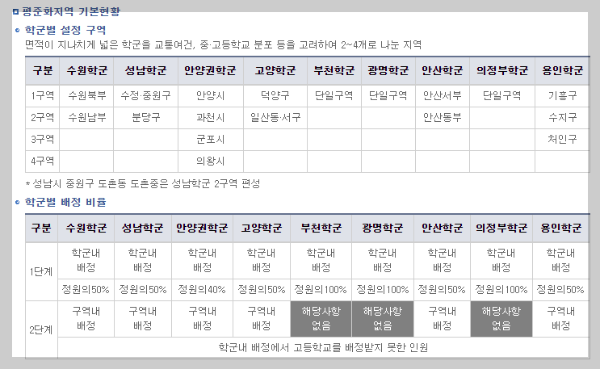 후기고(평준화지역) 배정은 지역별로 학군내배정(1단계), 구역내배정(2단계)로 나누는 지역이 있고, 단일구역으로 1단계로만 배정을 실시하는 지역이 있으므로 해당 지역의 배정방법을 잘 살펴야 합니다.