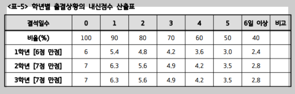 출결상황의 경우 미인정 지각, 조퇴, 결과를 학년 단위로 횟수를 합산하여 3회를 미인정 결석 1일로 계산합니다.