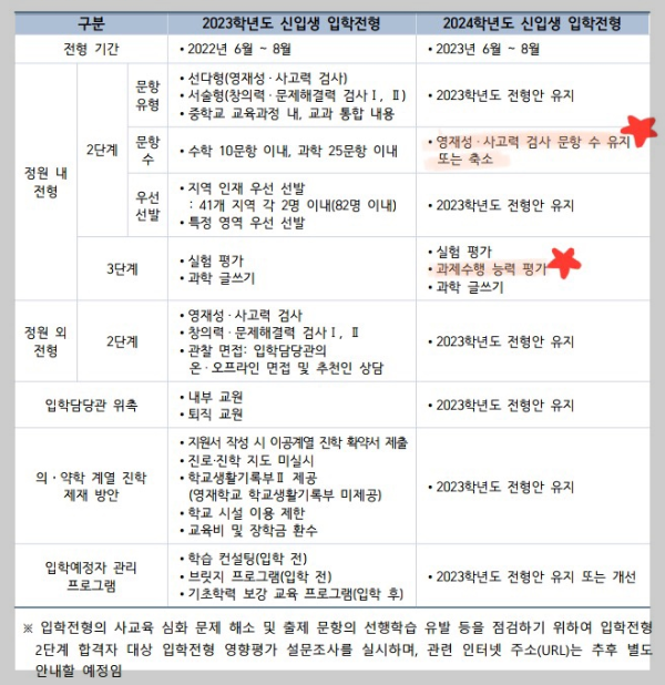 위에 보시면 아시겠지만 대부분 2023년도 전형안을 유지하지만 크게 2군데 변경된 내용이 보입니다.