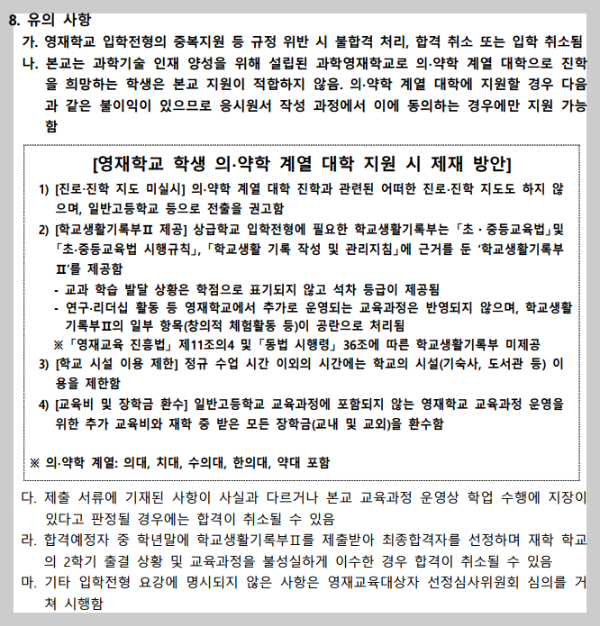 2022학년도부터 영재학교와 과학고 입학생은 의약학계열을 진학희망, 지원하게 되면 일반고 전출 권고, 교육비와 장학금 환수, 학교시설 이용제한 등 제재가 생깁니다.