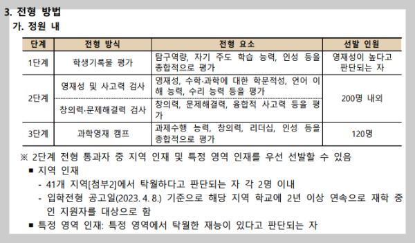 2단계의 선다형(영재성,사고력검사-기본유형)만 유지 및 축소하고, 대신 3단계인 캠프의 내용이 확대되었습니다.