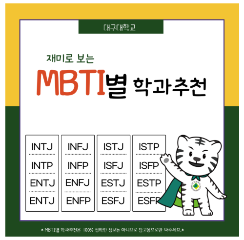 대구대학교 공식 블로그에서 MBTI별 학과를 소개하는 글이 있었는데, 한 번 볼까요?