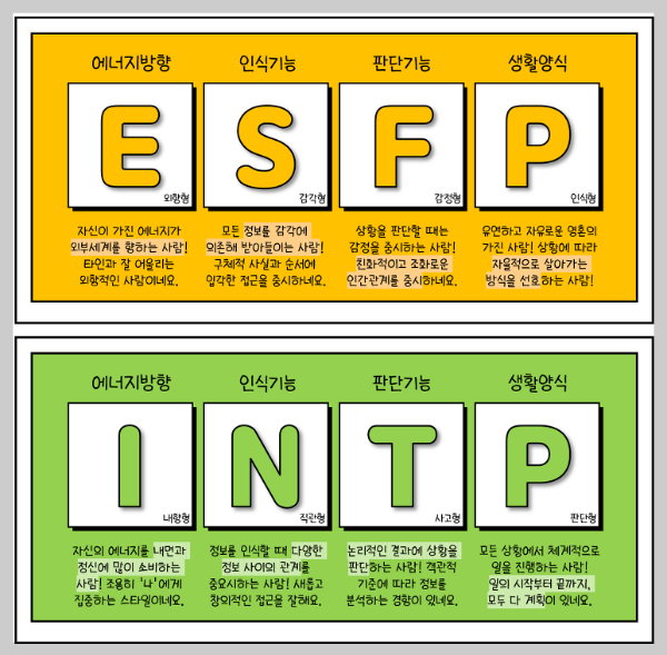 MBTI란 심리학자 브리그스와 마이어스가 인간의 성격을 4가지 척도로 분류한 성격유형검사로 전 세계에서 가장 유명한 성격유형검사 중 하나입니다.